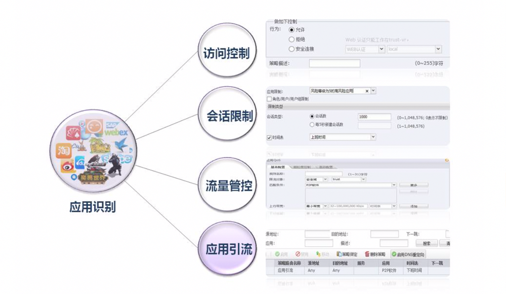 ●灵活应用控制。基于深度应用识别及精细化的应用筛选,K8凯发一触即发下一代防火墙支持灵活的安全控制功能。包括策略阻止、会话限制、流量管控、应用引流或时间限制等。